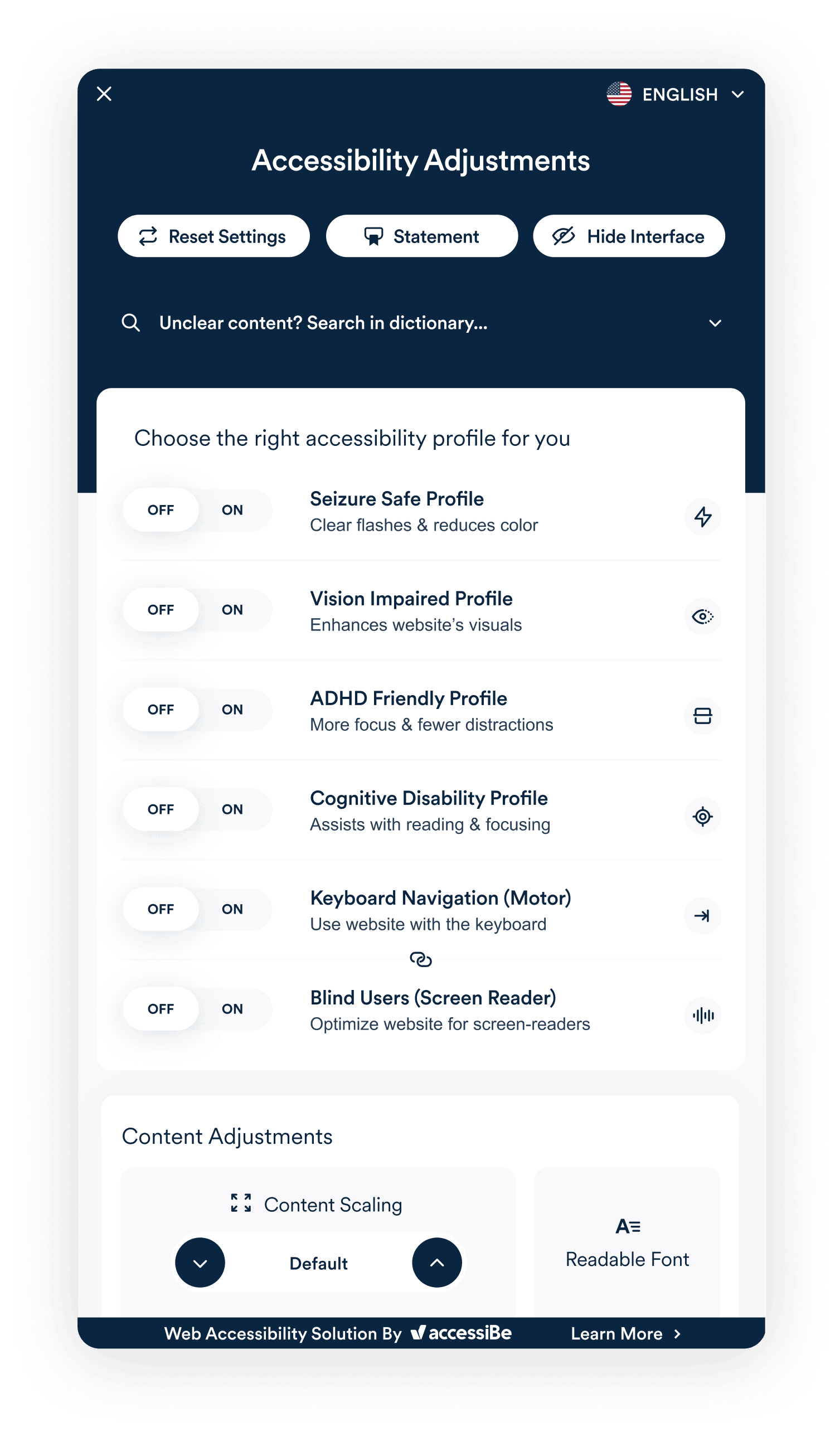 Each user can select a pre-made disability profile from an easy-to-access menu and adjust the interface to fit their unique needs